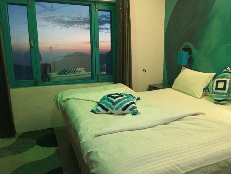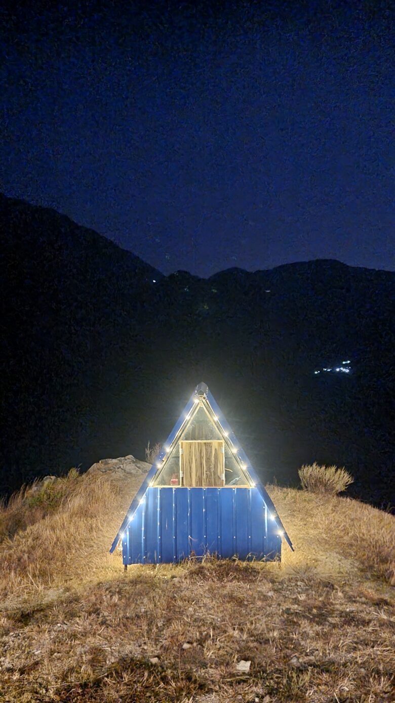 The south-facing aspect affords unimpeded views of the Kangra Valley. Measuring 42 square metres, with traditional Alpine woods, warm fireplaces, and natural-stone touches.